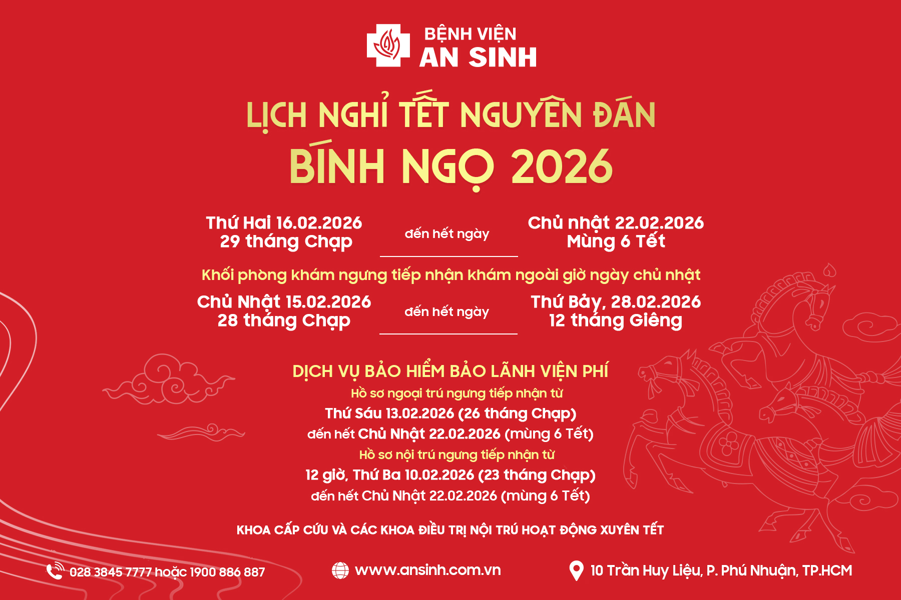 Bệnh viện Đa khoa An Sinh trân trọng gửi đến Quý Đối tác, Quý Khách hàng thông báo về lịch nghỉ Tết Nguyên Đán Bính Ngọ 2026. Chúng tôi chân ...