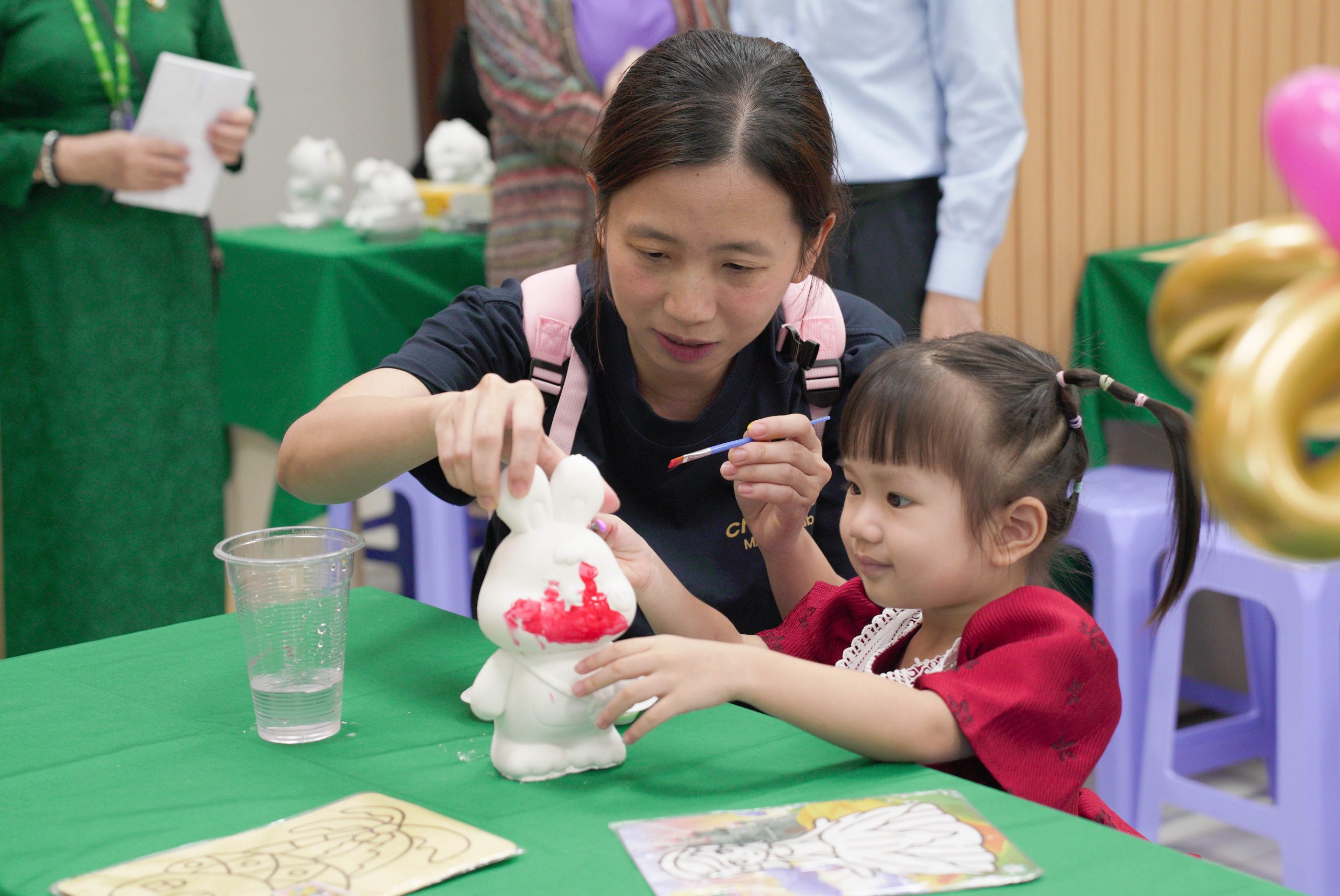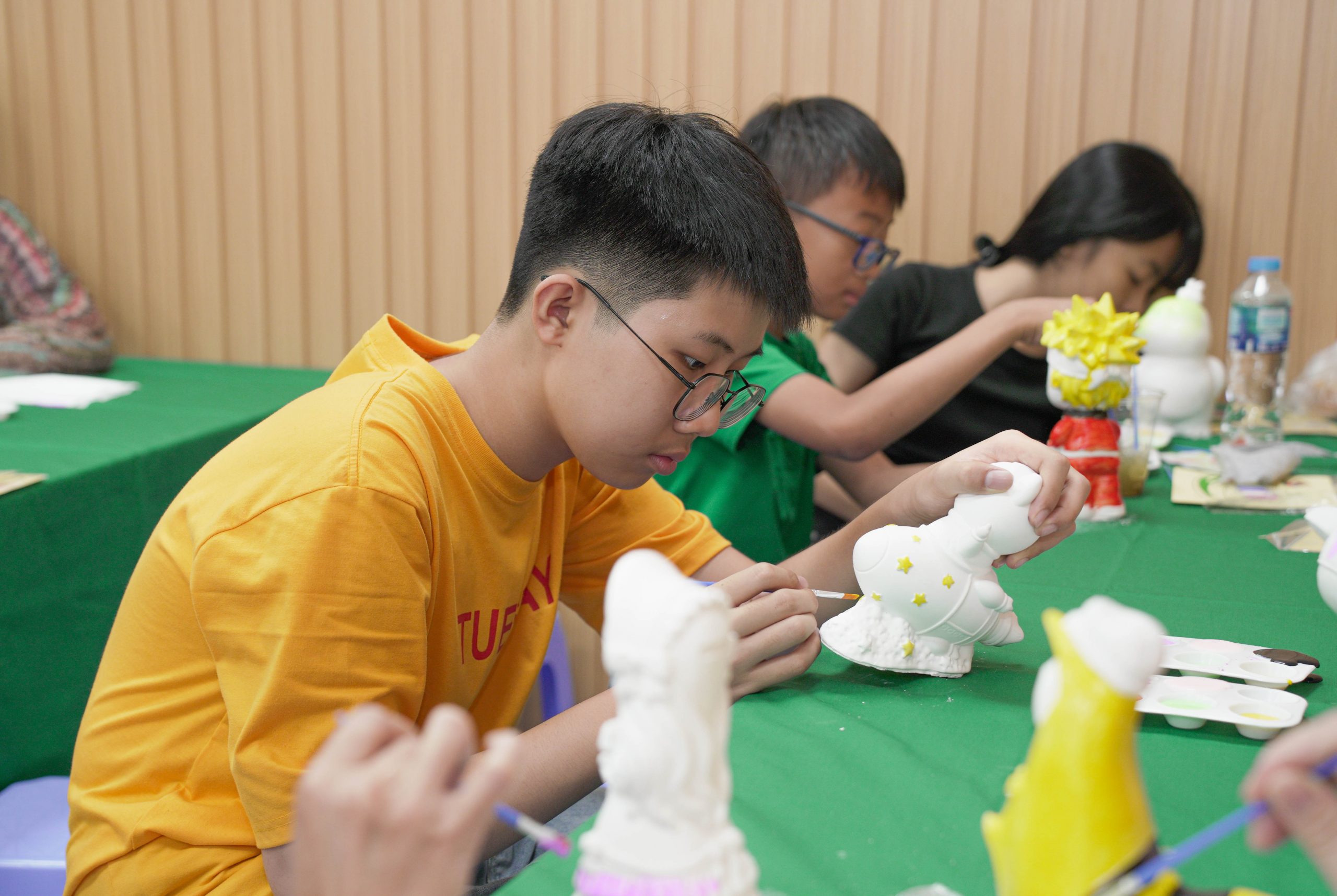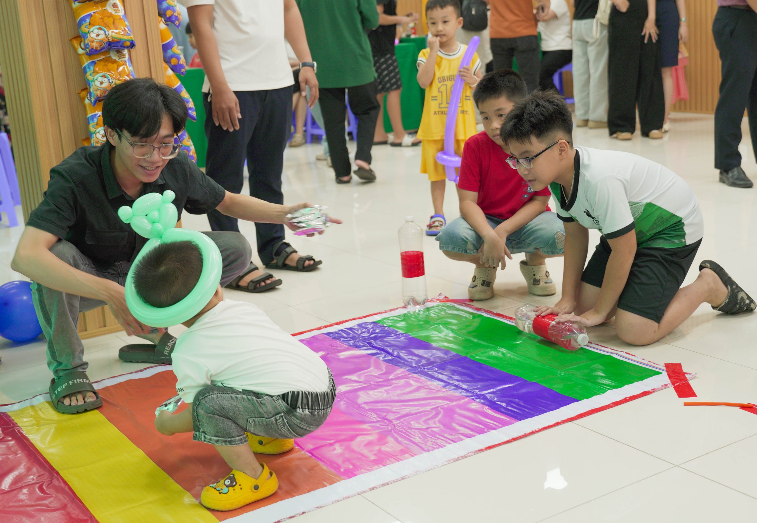 Không gian lễ hội như bừng sáng bởi những nụ cười trẻ thơ, ánh đèn lồng rực rỡ và sắc màu tuổi nhỏ. Các bé say mê vẽ tranh cát, tô tượng, vui thích phá cỗ và hào hứng tham gia trò chơi dân gian, thưởng thức văn nghệ và nhận quà từ chị Hằng – chú Cuội.