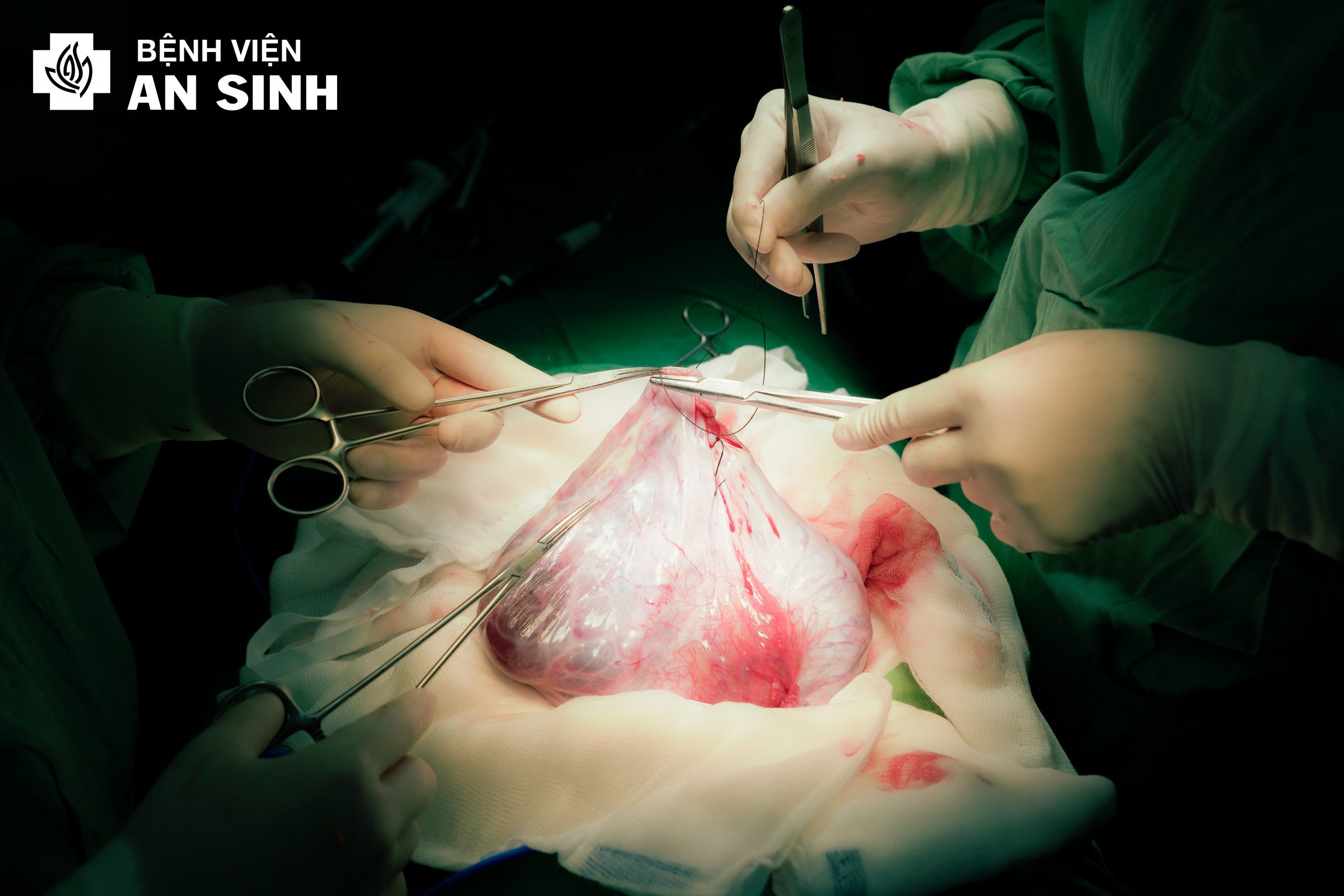 Các bác sĩ đã tiến hành phẫu thuật bóc tách và lấy trọn khối u một cách cẩn trọng, tránh làm vỡ u trong quá trình mổ – yếu tố quan trọng giúp đảm bảo an toàn và xác định chính xác giai đoạn nếu có nguy cơ ác tính.