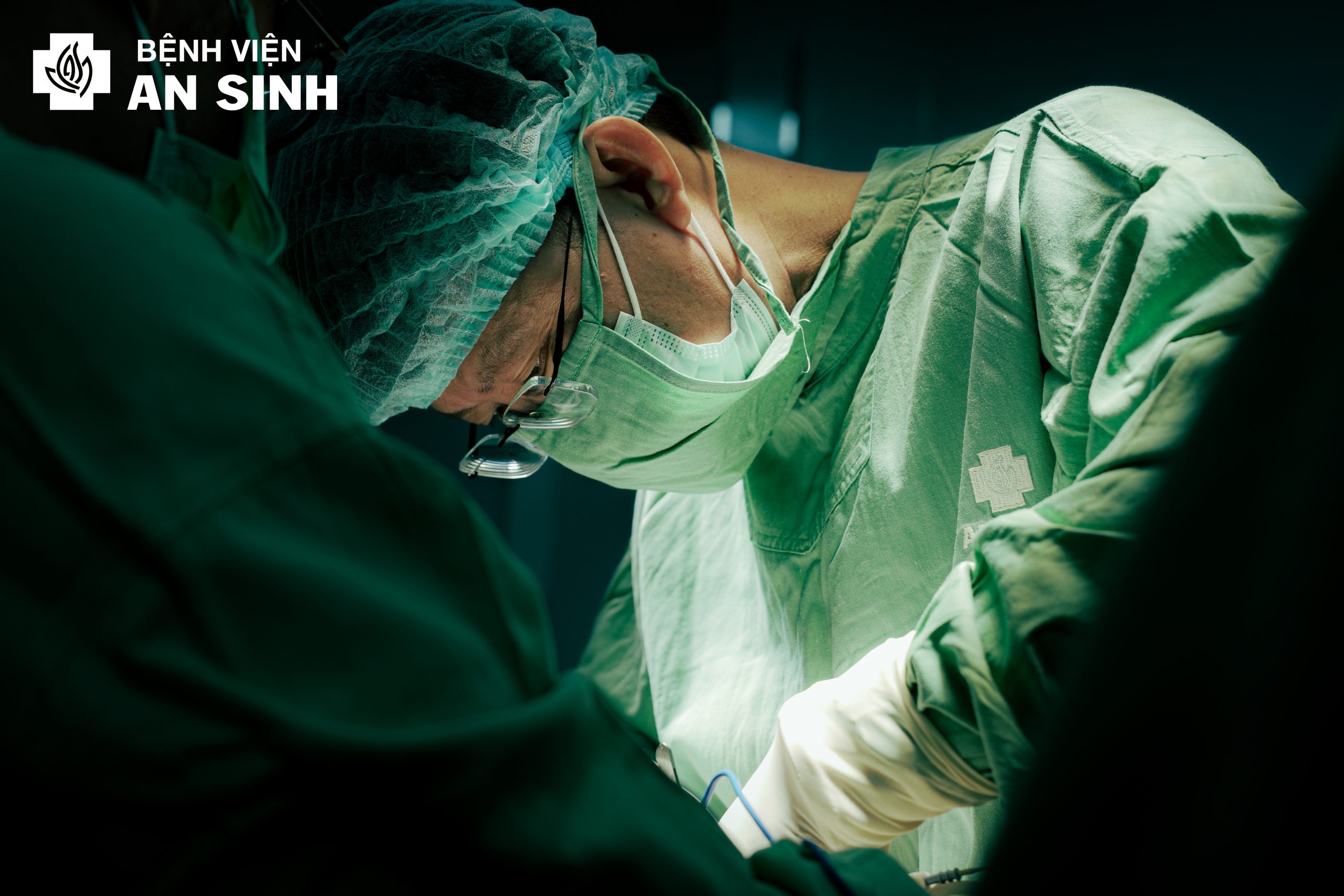 Toàn cảnh ê-kíp bác sĩ trong quá trình phẫu thuật, đảm bảo các yêu cầu vô khuẩn và an toàn tuyệt đối cho người bệnh.
